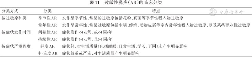 1.AR的分类:AR是特应性个体暴露于过敏原后发生的、主要由IgE介导的鼻黏膜非感染性慢性炎症性疾病,临床症状包括阵发性喷嚏、清水样涕、鼻痒、鼻塞等。AR可以按3种方式进行临床分类,如表11所示。