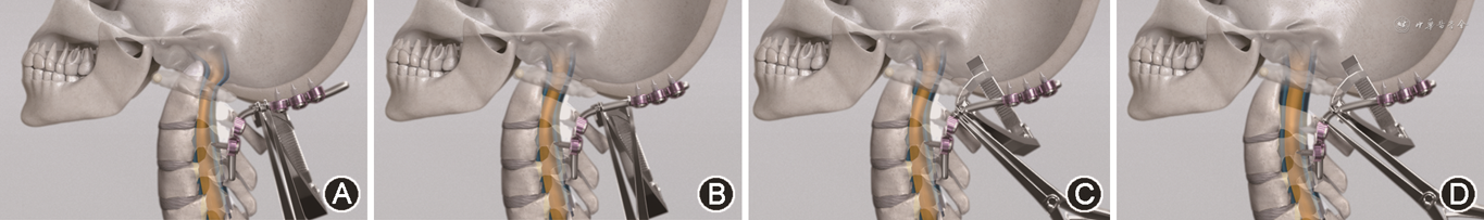 患者行全身麻醉气管插管,取俯卧位,体感诱发电位监测脊髓功能,应用Mayfield头架固定头部,适度牵引头架使头部略前屈,常规消毒铺巾,取枕部正中切口,逐层切开皮肤及皮下组织至骨面,分别于C2、C3各置入1对侧块螺钉(合并C2、C3分节不全患者于C3、C4椎置钉)。截取适当长度钛棒预弯,调整头架固定头部于中立位,旋紧螺帽固定颈椎螺钉,置入3对枕骨钉,行两步撑开复位[6](图1)。第一步(横向撑开):持棒钳于枕颈交界部牢固夹持钛棒(图1A),拧紧颈椎螺钉,于持棒钳和枕骨螺钉间适度撑开后拧紧枕骨螺钉,使颅骨向后向上移动,钛棒带动C2向前向下滑动获横向复位和部分纵向复位(图1B)。第二步(纵向撑开):撑开钳置于持棒钳与C2侧块螺钉间,松颈椎螺钉后适度撑开(图1C),使C2向下移动获纵向复位(图1D)。复位完成后锁紧内固定,小号骨刀联合磨钻于枕骨、寰椎后弓及C2~3椎棘突、椎板和关节突制备植骨床,应用燕尾形块状髂骨联合颗粒状自体松质骨及脱钙骨基质(decalcified bone matrix,DBM)人工骨行植骨,放置血浆引流管后逐层关闭切口。