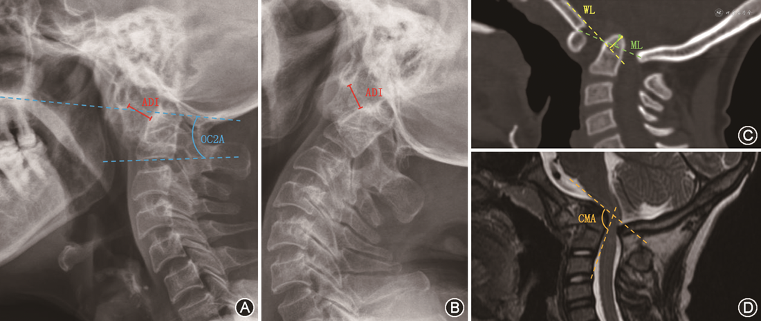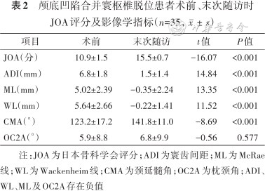 注:JOA为日本骨科学会评分;ADI为寰齿间距;ML为McRae线;WL为Wackenheim线;CMA为颈延髓角;OC2A为枕颈角;ADI、WL、ML及OC2A存在负值