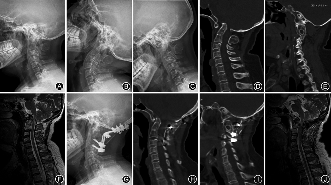 本组所有患者术中切口愈合良好,无切口感染、延迟愈合,无脊髓神经及重要血管损伤。所有患者未见内固定松动、断裂。末次随访时,3例患者存在吞咽困难,1例患者后方植骨未融合,颈椎动力位X线片未见不稳,内固定无松动、移位,寰枢椎侧块关节间部分自发融合,患者无不适,予以密切观察,未行特殊处理。