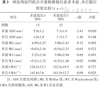 两组颅底凹陷合并寰枢椎脱位患者术前、术后脱位程度比较()