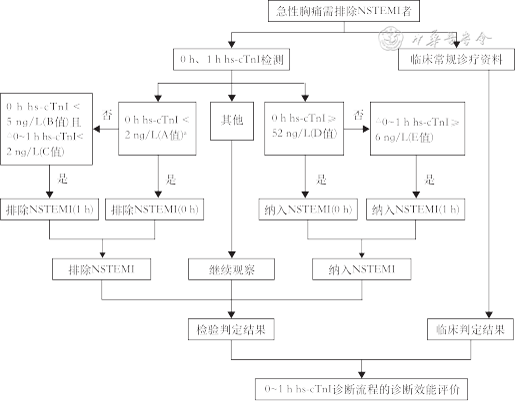 本研究局限性在于大部分患者检测结果为普通cTnI,可能会减低其临床诊断的敏感性。总之,hs-cTnI的广泛应用使临床可以更加快速准确地进行诊断和干预。本研究验证了0~1 h的hs-cTnI浓度及其变化对于判断NSTEMI的流程在中国人群中的应用价值,并对指南流程进行简化,验证了在排除诊断时不考虑就诊时胸痛时间仍有很高准确性。这一结果为进一步推动hs-cTnI在NSTEMI患者中的应用提供了依据,但尚需更大规模的临床研究加以验证。
