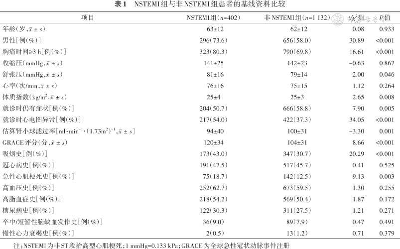 | 项目 | NSTEMI组(n=402) | 非NSTEMI组(n=1 132) | t/χ2值 | P值 |