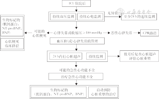 推荐意见:(1)监测心脏功能和血压的变化,前者包括心电图、心肌酶谱、BNP、N末端B型利钠肽前体(NT-proBNP)以及超声心动图等检查(C级水平,Ⅰ级推荐)。(2)积极纠正脑血管病(C级水平,Ⅰ级推荐),具体参照《中国急性缺血性脑卒中诊治指南(2018)》[43]。(3)保护心脏功能,针对性地处理高血压、心律失常、急性心功能障碍(C级水平,Ⅰ级推荐)(图1)。