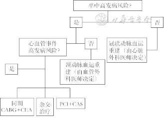 (2)既往有卒中病史的CHD:以往研究大多围绕合并颈动脉中~重度狭窄的CHD患者接受CABG与颈动脉干预治疗(CEA或CAS)进行,联合治疗方式包括:①分期:先CEA后CABG;②分期:先CABG后CEA;③同期:CEA+CABG;④分期:先CAS后CABG;⑤同期CAS+CABG。以往发表的荟萃分析显示[54, 55, 56, 57, 58],大多数患者(>80%)为无症状单侧颈动脉狭窄,大多数患者报告30 d死亡/卒中发生率为7%~8%。来自管理数据库注册研究的数据显示[59, 60, 61],无症状颈动脉狭窄患者的30 d死亡/卒中发生率在6%~10%之间,有卒中/TIA病史者接受分期/同期CEA+CABG(14%)或CAS+CABG(44%)的手术风险最高[59]。