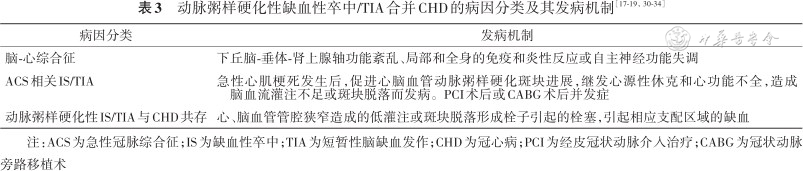 本共识依据IS/TIA、CHD的肯定(潜在)病因及其临床特点,将动脉粥样硬化性IS/TIA合并CHD按相关性分为脑-心综合征(brain-heart syndrome或cerebral cardiac syndrome,CCS)、ACS相关IS/TIA、动脉粥样硬化性IS/TIA与CHD共存三大类,其病因分类及其发病机制之概述见表3。