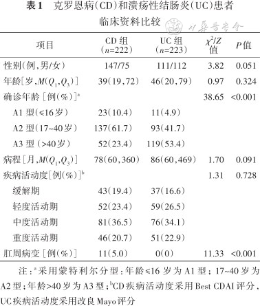| 项目 | CD 组 (n=222) | UC 组 (n=223) | χ2/Z值 | P值 |