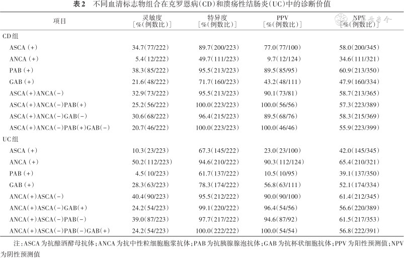 注:ASCA为抗酿酒酵母抗体;ANCA为抗中性粒细胞胞浆抗体;PAB为抗胰腺腺泡抗体;GAB为抗杯状细胞抗体;PPV为阳性预测值;NPV为阴性预测值