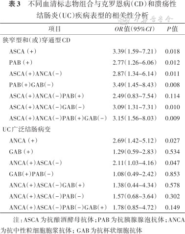 4. 血清标志物与疾病表型的关系:通过logistic回归分析,单项标志物ASCA(+)、PAB(+),双联ASCA(+)ANCA(-)和PAB(+)GAB(-),三联ASCA(+)ANCA(-)GAB(-)和四联标志物ASCA(+)ANCA(-)GAB(-)PAB(+)与狭窄型和(或)穿通型CD有关联(均P<0.05);而对于UC患者,单项标志物ANCA(+)、双联ANCA(+)ASCA(-)与UC广泛结肠病变有关联(均P<0.05),见表3。