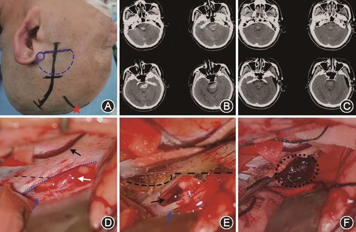 3. 典型病例:57岁男性患者,因“突发意识障碍5 h余”入院。外院CT提示脑干出血,入院后完善CTA提示原发性脑干出血,血肿量约12 ml,主要位于桥脑上部偏腹外侧。急诊行颞下岩前入路桥脑血肿清除术,手术顺利,术后CT提示残余血肿量约1 ml,清除率为91.7%。手术后经过为期2周的对症治疗后清醒出院,至当地医院进一步康复治疗(图1)。