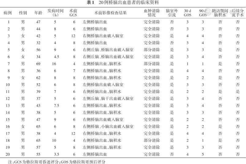 1. 手术情况:所有患者均采用颞下岩前入路开颅血肿清除术,其中血肿破入脑室或合并有脑积水的患者在清除血肿前先行脑室外引流,共计16例。20例患者均在发病24 h内(3.5~16.0 h)进行手术治疗,12例患者在发病6 h内进行手术治疗,血肿均完全清除,发病6 h后进行手术治疗的患者血肿完全清除率为5/8。6 h内进行手术治疗的患者30 d内病死率为0,90 d后预后良好率为7/12,6 h后进行手术治疗的患者的30 d内病死率为1/8,90 d后预后良好率为1/8。