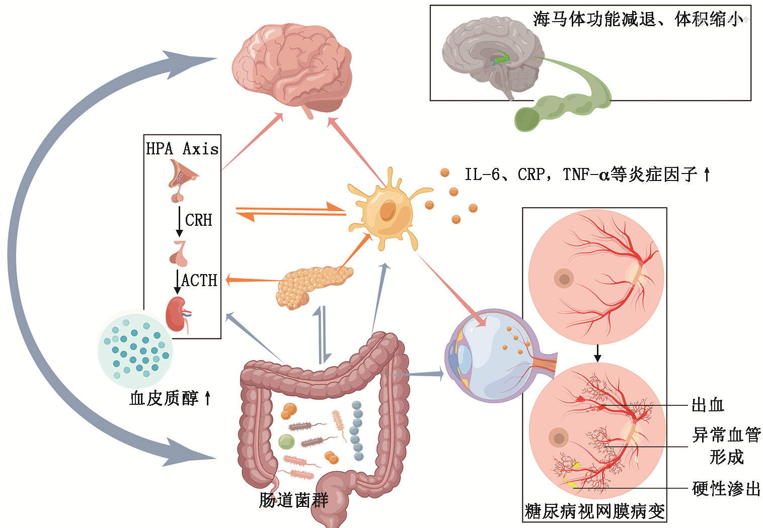 抑郁患者的视网膜神经纤维层变薄,眼科检查可能表现为活动性慢性炎症及神经退行性病变,成为精神疾病早期诊断的潜在生物标志[24]。DR及相关心理疾病的神经生物学机制研究尚处于起步阶段,主要集中于糖尿病和DR与焦虑和抑郁可能存在相同的分子调控机制(图1)。随着器官互作领域的深入研究,心理因素与DR发生发展的神经生物学机制将被更清晰地阐明。