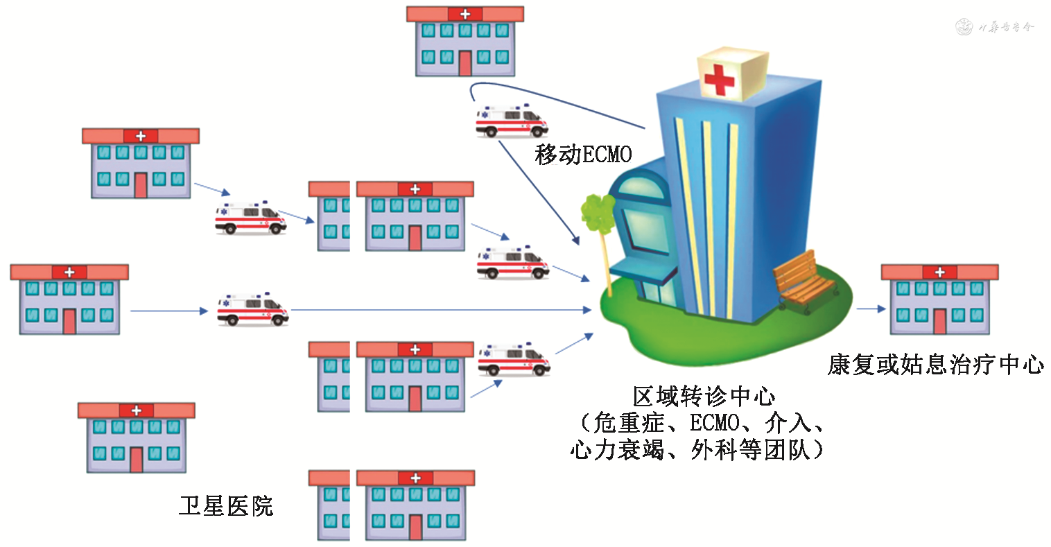 近年来,某些发达国家进行了CS 协作的探索,在德国的一项单中心回顾研究中,转运至区域医疗中心的CS患者死亡率仍然很高。这项研究的局限性在于没有非转运的对照组患者、对死亡风险的评估不足,影响研究结果[23]。美国进行的多中心回顾研究显示,卫星医院及时诊疗+中心医院转运的患者预后良好(直接在卫星医院死亡率47.8%,直接在中心医院39.3%,转运33.4%,P<0.01),MCS、VAD植入和CABG等均明显增多[32]。