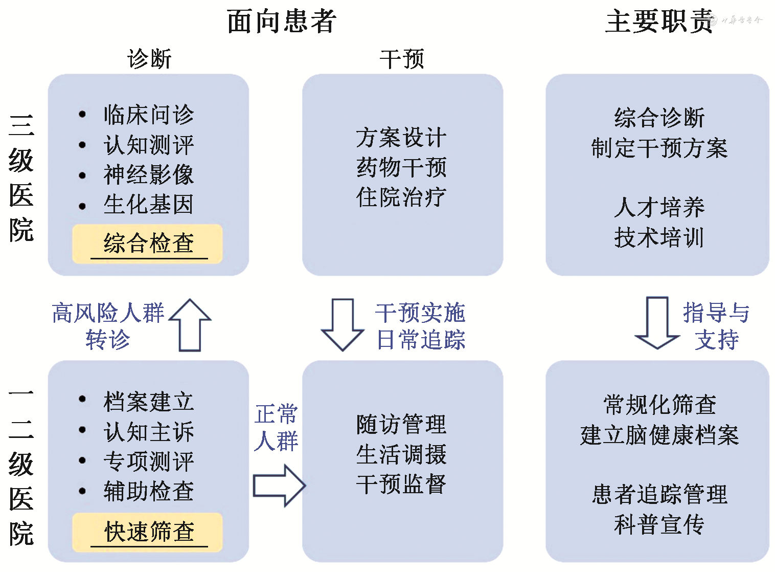 一、二级医院及时向上级综合性医院和专科医院转诊筛查出的认知障碍高风险人群;患者在上级医院的诊疗完成后,一、二级医院应为患者实施认知功能的康复和护理,及时追踪患者病情进展,为患者和家属提供生活指导和教育培训[34,47, 48]。