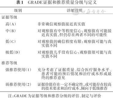 2.指南编写方法:本指南采用推荐分级的评估、制定与评价(grading of recommendations assessment,development and evaluation,GRADE)分级系统[5](http://www.gradeworkinggroup.org/)进行证据质量和推荐意见的分级,证据等级分为高(A)、中(B)、低(C)、极低(D)四个级别,推荐等级分为强(1)和弱(2)两个级别,GRADE证据质量和推荐强度分级的具体含义汇总见表1。