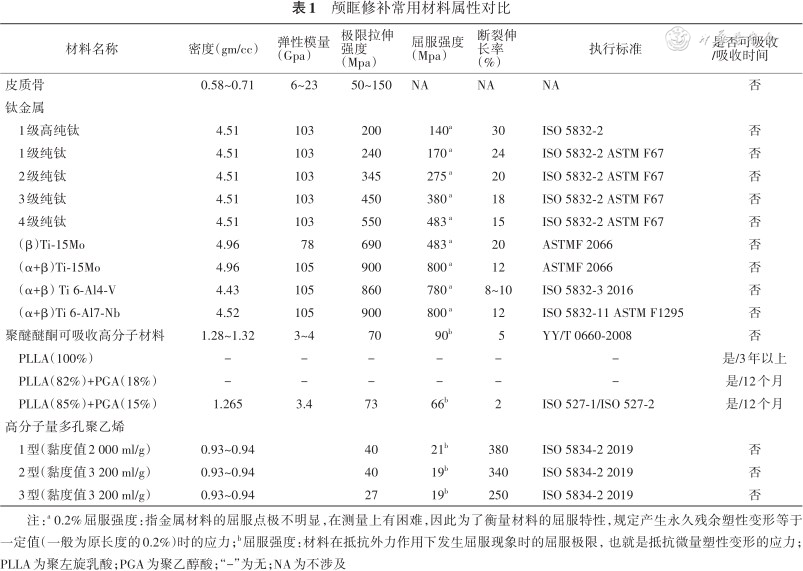 人体颅骨分为脑颅和面颅两部分,脑颅呈卵圆形并围成颅腔,容纳并保护脑组织,面颅形成颜面的基本轮廓,例如构成眼眶、口腔和鼻腔等。颅骨和眼眶相互比邻,构成的骨板均为非承重骨,表面具有一定弧度且相对不规则,通常无法进行自我修复,需要使用辅助材料进行修补和重建,这就要求神经外科医师和眼科医师了解和熟悉材料本身的属性,才能制定合理的重建方案,实现个性化修补。目前应用于颅眶临床修补和重建的常用材料属性汇总见表1。
