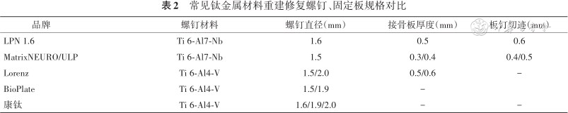 钛金属广泛用于钉、板和网等植入物,可以制作成具有一定弧度和形状的颅眶重建和修补材料。颅骨重建和修复中使用的接骨板主要为固定骨瓣的2孔、4孔、雪花状盖孔板,在选择时应关注钛板厚度和板钉切迹,越低的切迹能够带来越好的术后美观度并减少术后并发症;钛网则包括二维和三维钛网(厚度约为 0.6 mm),其中二维钛网常用于额部、颞顶部等部位缺损的颅骨修补;三维钛网结合计算机辅助技术高度还原了缺损颅骨处三维解剖立体形态,塑形满意度较高,可帮助缩短手术时间[1]。眶周骨重建和修复中使用的钛板主要是12孔弧形眶缘板及6、8、20孔的直型板,钛网常常会根据眼眶骨壁的生理形态进行预塑形,厚度较薄(0.4 mm)。但钛金属也存在“应力遮挡”、温度易感等缺点[2]。目前临床常用钛金属材料规格可见表2。