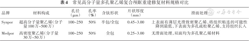 高分子量多孔聚乙烯的强度和稳定性好,与钛金属结合的复合材料能进一步提升强度且维持塑形,能够与相邻软组织结构融合生长[9]。目前主流应用材料的分子量为100万~500万,保证了材料的灵活性和柔韧性,两面为不同材料,能够减少与软组织的粘连,保证眼外肌、眼球等眼眶内组织的正常活动度。目前临床常用高密度聚乙烯材料规格见表4。