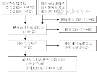 通过数据库检索及手工检索既往系统评价纳入研究列表,除重后共获得3 203篇文献,最终纳入11项研究(13篇文献)。其中对照研究3项(3篇文献)[24, 25, 26],非对照研究8项(10篇文献)[27, 28, 29, 30, 31, 32, 33, 34, 35, 36]。文献筛查流程见图1。