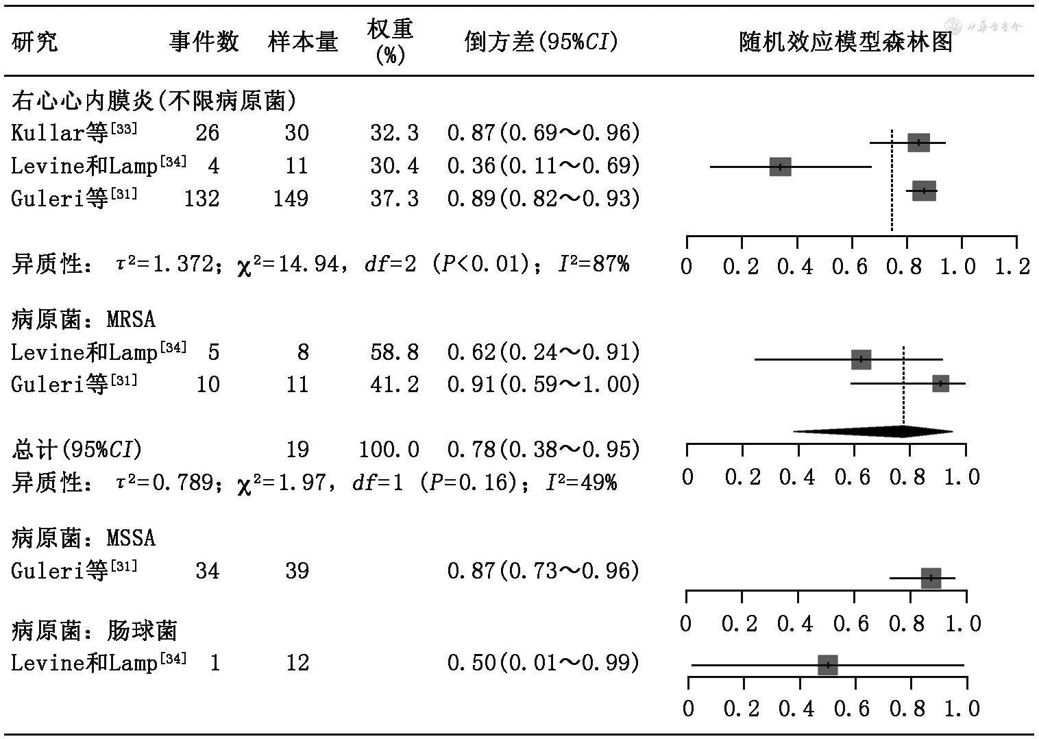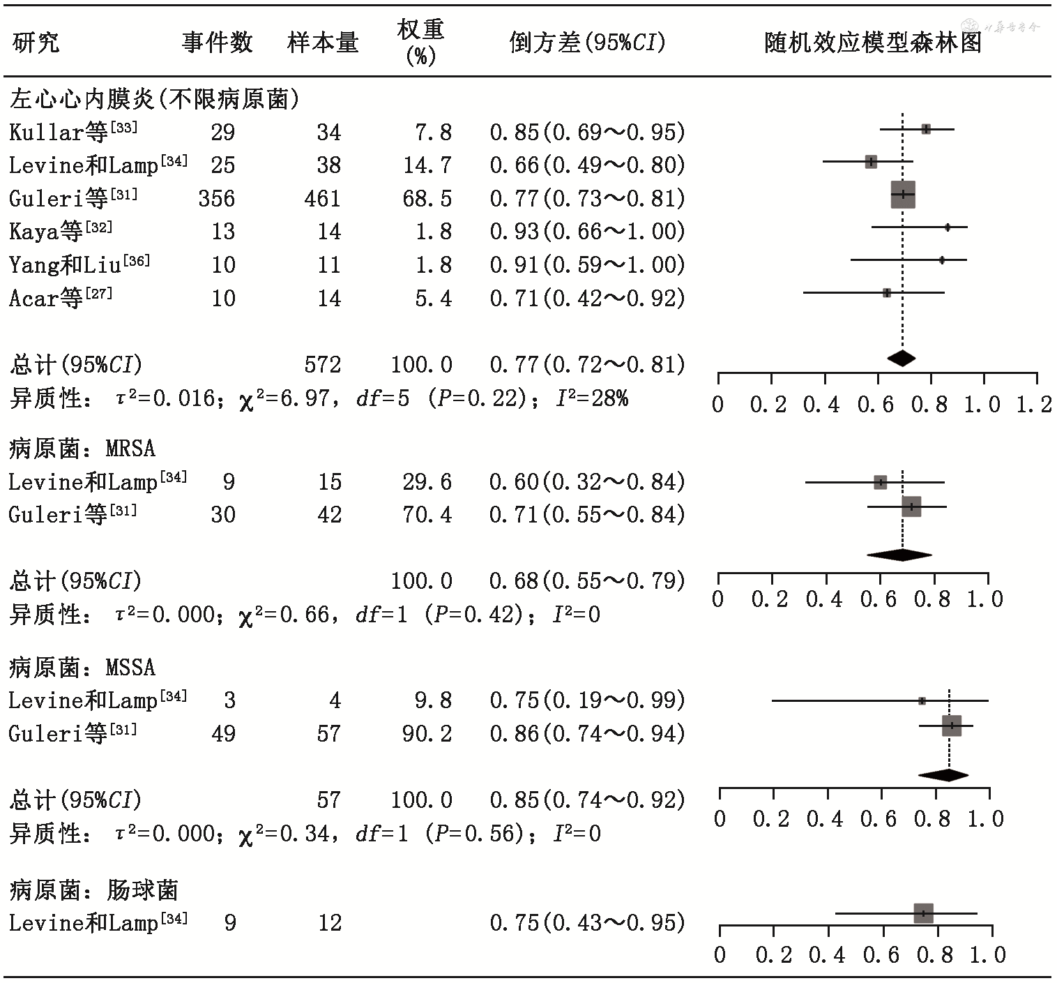 1. 临床治疗成功率:(1)左心心内膜炎:6项研究共纳入575例患者,其中包括514例左心心内膜炎以及61例左右两侧心内膜炎[27,31, 32, 33, 34,36]。荟萃分析结果显示,平均临床成功率为77%(95%CI:70%~83%,I2=28%)(图2)。其中有2项研究分别报道了MRSA、MSSA和肠球菌3种革兰阳性菌的亚组临床治疗成功率[31,34]。亚组分析结果显示(图2),感染MSSA的患者平均临床成功率最高,为85%(95%CI:74%~92%,I2=0)[31,34];感染肠球菌的患者临床成功率为75%(95%CI:45%~92%)[34];感染MRSA的患者平均临床成功率相比较稍低,为68%(95%CI:55%~79%,I2=0)[31,34]。(2)右心心内膜炎:3项研究的右心心内膜炎亚组共纳入193例[31,33, 34],其中Kullar等[33]的研究中临床治疗成功率为36%~89%(因纳入研究较少,异质性较高,未进行全纳入研究荟萃分析)(图3)。亚组分析结果显示(图3),感染MSSA的患者平均临床成功率最高,为87%(95%CI:73%~95%)[31],感染MRSA的患者平均临床成功率为78%(95%CI:38%~95%,I2=49%)。(3)另有2项研究未报道左心或右心心内膜炎[28,35],且无相应亚组分析。