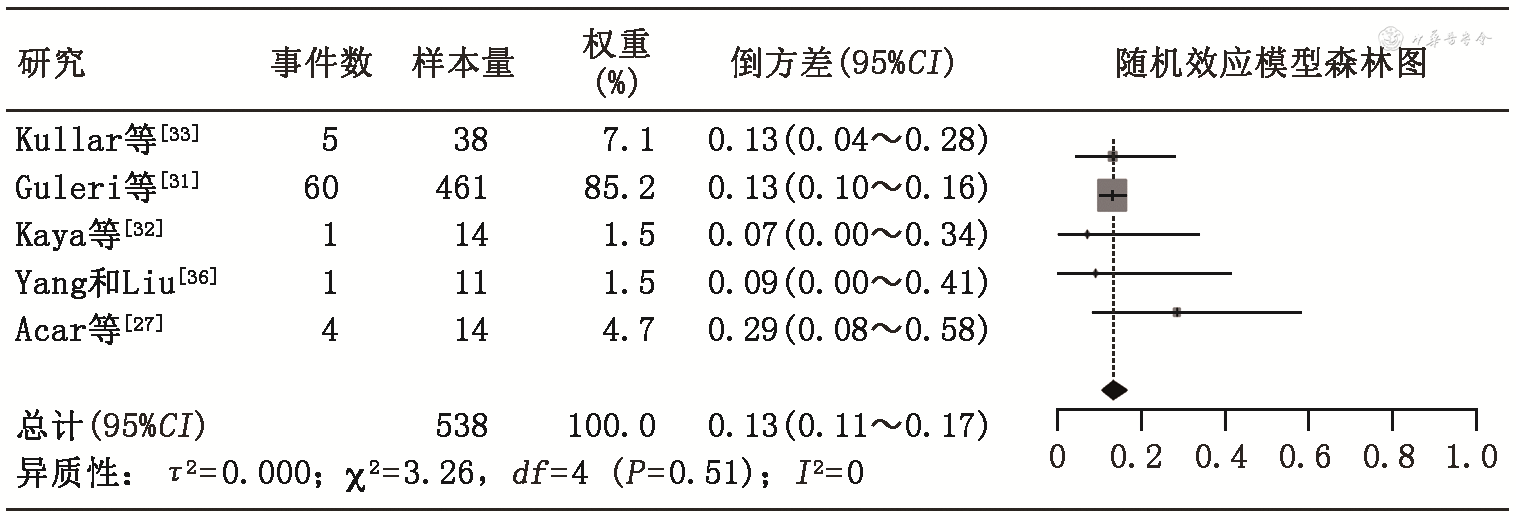 2. 死亡:(1)左心心内膜炎:共纳入5项研究,死亡率为7%~29%[27,31, 32,34,36]。荟萃分析结果显示,平均死亡率为13%(95%CI:11%~17%,I2=0)。Acar等[27]研究中的死亡率最高(图4)。(2)右心心内膜炎:共纳入2项研究[31,34](n=160),其中8例死亡,2项研究中死亡率分别为3%和27%。(3)另有Sandoe和Baig[35]的研究(n=19,未报道左心或右心心内膜炎)显示中国的死亡率为21.05%。