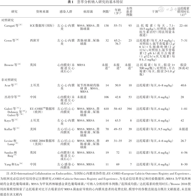 注:ICE=International Collaboration on Endocarditis,为国际心内膜炎协作组;EU-CORE=European Cubicin Outcomes Registry and Experience,为欧洲克必信治疗结局登记注册研究;CORE=Cubicin Outcomes Registry and Experience,为克必信结果登记和经验数据库;MRSA为甲氧西林耐药金黄色葡萄球菌;MSSA为甲氧西林敏感金黄色葡萄球菌;a可纳入分析的样本例数;b范围或均值;c达托霉素的使用时长;dBrowne 2016使用决策模型探索了达托霉素对比万古霉素治疗MRSA菌血症导致的心内膜炎患者的花费比较,模型中的参数直接选自既往文献报道,未直接报道在该文献内