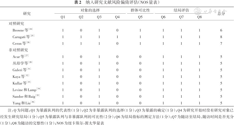 注:Q为问题;Q1为暴露队列的代表性(1分);Q2为非暴露队列的选择(1分);Q3为暴露的确定(1分);Q4为研究开始时没有研究对象已经发生研究结局(1分);Q5为暴露队列与非暴露队列的可比性(2分);Q6为结局指标的测定方法(1分);Q7为随访至结局,随访时间是否充分(1分);Q8为随访的完整性(1分);NOS为纽卡斯尔-渥太华量表