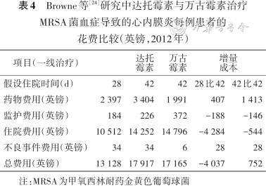 2. 达托霉素治疗金黄色葡萄球菌心内膜炎的花费:另一项对照研究(Browne等[24])使用决策模型探索了达托霉素对比万古霉素治疗MRSA菌血症导致的心内膜炎患者的花费比较。研究结果发现达托霉素作为一线治疗,相较于万古霉素可为每例患者节省医疗费用4 037英镑(表4)。该研究模型下推论,当住院时间减少3 d,首选达托霉素治疗即可比首选万古霉素带来更少的医疗花费。
