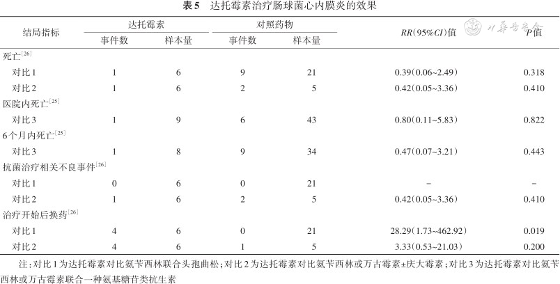 3. 达托霉素治疗肠球菌心内膜炎:共2项对照研究报道了达托霉素治疗肠球菌心内膜炎患者的疗效,共纳入84例患者[25, 26]。结果显示,在死亡、不良事件及住院时间等结局上,达托霉素与对照组差异均无统计学意义(均P>0.05);而达托霉素组患者相较氨苄西林联合头孢曲松组患者治疗后的换药率升高(RR=28.29,95%CI:1.73~462.92,P=0.019)(表5)。另外,其中一项对照研究报道了住院时间[26],达托霉素组(n=6)、氨苄西林联合头孢曲松组(n=21)、氨苄西林或万古霉素±庆大霉素组(n=5)的住院时间[M(Q1,Q3)]分别为43(14,77)d、32(13,71)d、45(13,71)d;另一项对照研究则报道了幸存者中位住院时间[25],达托霉素组(n=8)的住院时间为17.5(13.5,19.5)d,氨苄西林或万古霉素联合一种氨基糖苷类抗生素组(n=37)的住院时间为31(19,50)d。