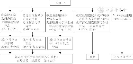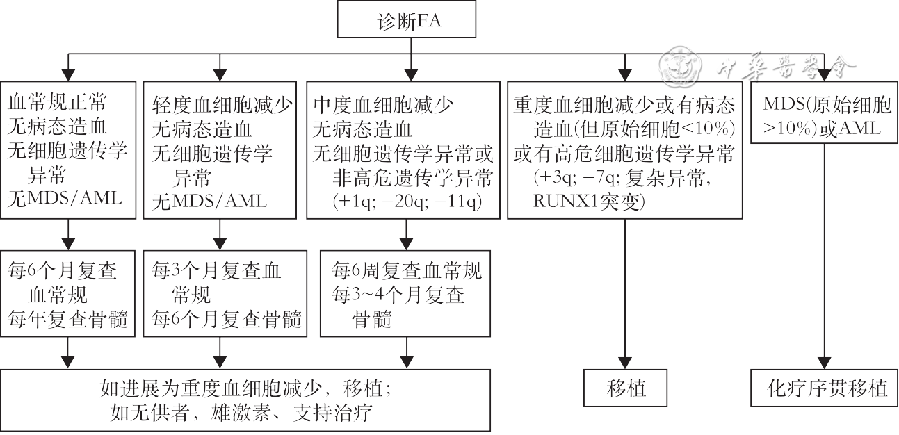 监测血常规,每年评估骨髓涂片、染色体和活检,评估风险和及时发现MDS或AML。建议患者的所有同胞行DEB/MMC诱导的染色体断裂试验或分子遗传学检测(如果已确认家族特异的致病基因),早期诊断、治疗,监测身体发育异常、骨髓衰竭和相关肿瘤。