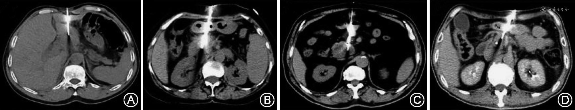 非经脏器路径组共有12.4%(28/225)患者出现并发症。有4.9%(11/225)患者出现血淀粉酶升高;7.6%(17/225)患者腹腔出血,除1例出现活动性出血进行了手术治疗外,余出血均为穿刺道、靶病变周围局限血肿,经内科保守治疗好转。