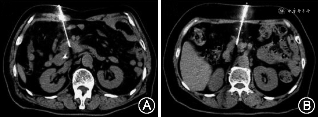 1. 路径选择:术中根据病变位置选取体位,CT扫描(必要时行增强扫描),结合术前增强CT或MRI确定穿刺路径,应用2%利多卡因进行局部浸润麻醉。根据术中CT扫描图像设计穿刺路径,若有非经脏器路径则选择非经脏器路径;若穿刺路径被脏器遮挡,无法避开时则选择经脏器路径。常用的经脏器路径包括经肝脏、胃、小肠和结肠。