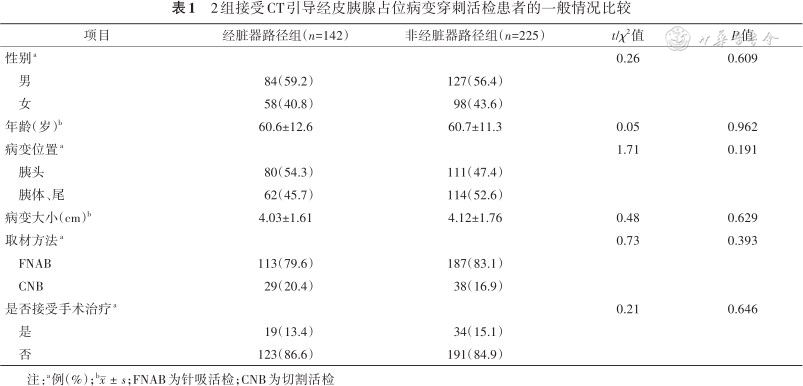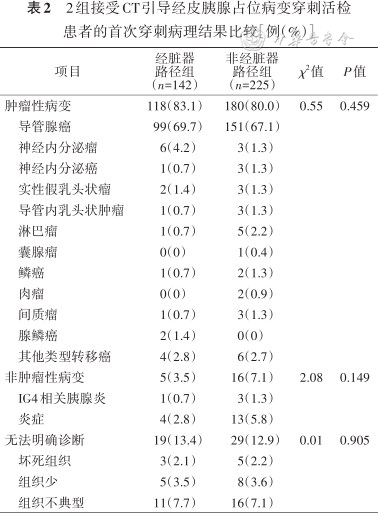 2组接受CT引导经皮胰腺占位病变穿刺活检患者的一般情况比较