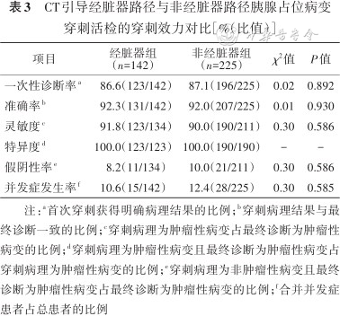 CT引导经脏器路径与非经脏器路径胰腺占位病变穿刺活检的穿刺效力对比[%(比值)]