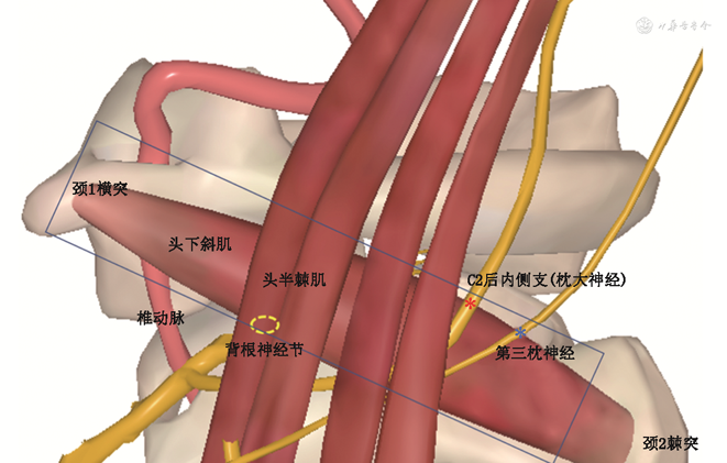 对于CEH的发病机制,目前广泛的观点认为,C1~C3及其支配的结构是CEH的主要解剖学基础[12, 13, 14],低位颈神经及颈部肌肉等软组织亦有可能引起CEH。第2颈神经(C2)后支于寰椎后弓与枢椎椎弓板之间、头下斜肌的下侧穿出,发一细支至头下斜肌,并与C1后支交通,然后分为较小的外侧支及较大的内侧支,外侧支支配头长肌、颊肌、头半棘肌,并与C3相应的分支连结;内侧支为枕大神经,穿颈部固有筋膜分布于上项线以上,可达颅顶的皮肤,当枕大神经绕过头下斜肌时,与C1及C3后支的内侧支连结,形成颈后神经丛。C2后支穿行于椎板和(或)上下关节突关节形成的骨性纤维管内,出管后行走于颈部诸肌及固有筋膜内。由于上颈段活动度大,颈部肌肉与颈椎骨性结构接触面更容易出现劳损,颈部长期受凉易造成肌筋膜炎,颈部外伤和长期不良姿势均可造成不同程度关节突退行性变,这些因素均可导致高位颈神经受到刺激,引起疼痛。有学者通过对枕下三角区的基础解剖学的研究,发现枕下三角区的肌肉痉挛、粘连,刺激周围走行神经,也可能引起CEH的发作[15]。
