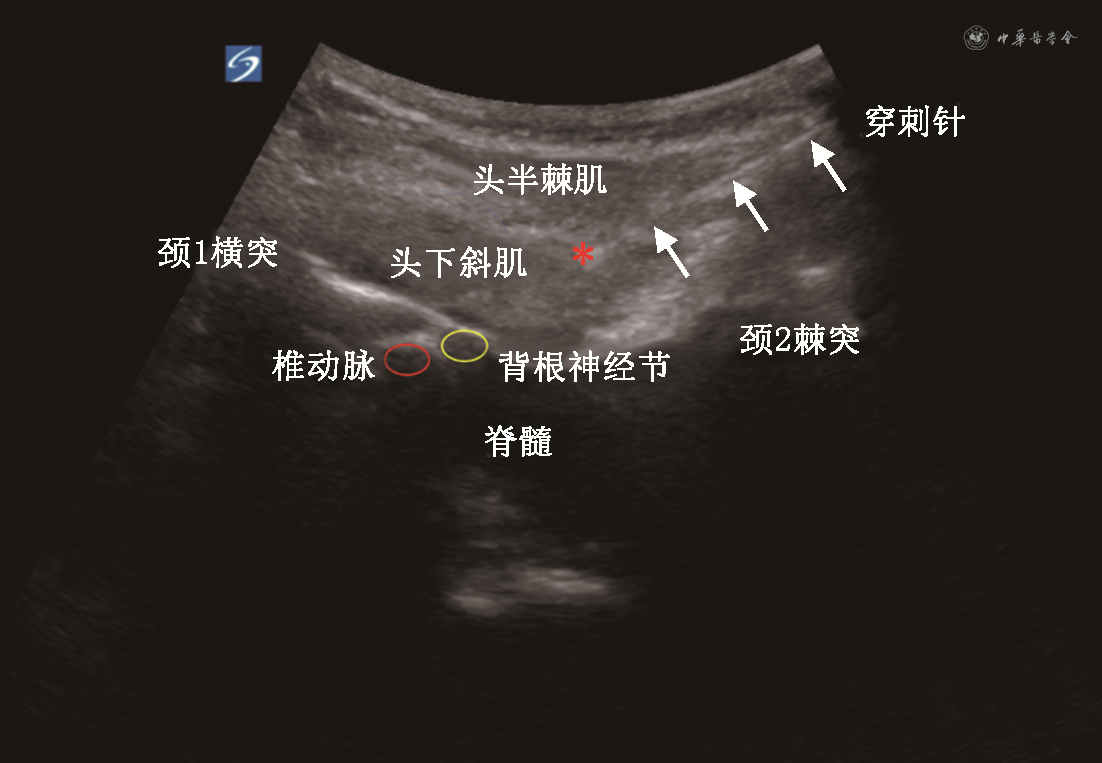 2.低温等离子消融术组治疗过程:本研究所有手术均由同一位高年资主任医师完成。入室准备,取侧卧位,患侧向上(双侧疼痛患者,严重侧在上)。常规消毒铺巾,在低频超声探头引导下,寻找头下斜肌长轴和头半棘肌平面(图1)。用长度10 mm的18 G(优尼特公司,批号207265209151-412)穿刺套管进行平面内穿刺,调整穿刺角度深度,直至到达靶点(图2),以能够完全复制患者术前疼痛特征作为确定最佳穿刺针位置的标准。行低温等离子消融术时,从穿刺套管中取出针芯,置入一次性等离子体手术刀头,选择2档进行消融,每个消融周期为30 s,共6个周期。