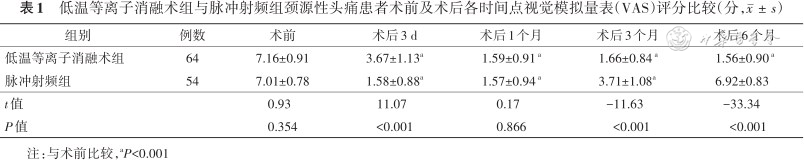 组间比较:低温等离子消融术组与脉冲射频组在术后3 d、3个月、6个月的VAS评分差异有统计学意义(均P<0.001)。组内比较:低温等离子消融术组术后各时间点VAS评分较术前均有明显下降,差异均有统计学意义(均P<0.001);脉冲射频组术后3 d、1个月、3个月VAS评分较术前均有明显下降,差异均有统计学意义(均P<0.001)。结果见表1。