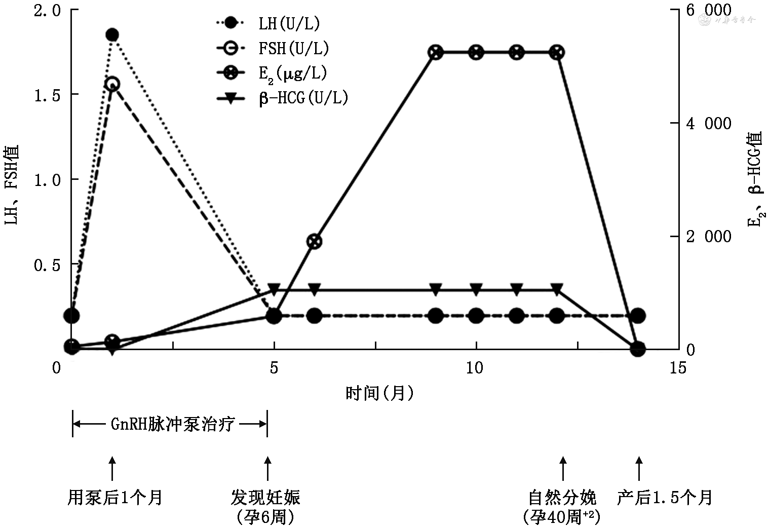 综上,本文报道了1例罕见的CHH女性患者经生理性雌、孕激素替代治疗到脉冲GnRH治疗后出现青春期发育到成功生育的诊治经过。生理性雌、孕激素替代治疗需循序渐进,避免出现乳房发育不美观。脉冲GnRH治疗通过模拟正常GnRH脉冲释放模式,重启CHH女性患者下丘脑-垂体-卵巢轴的功能,诱导排卵并新建生育能力。一旦发现妊娠后,需及时暂停脉冲GnRH治疗,避免潜在流产风险。