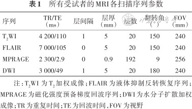 注:T2WI 为T2加权成像;FLAIR为液体抑制反转恢复序列;MPRAGE为磁化强度预备梯度回波序列;DWI为水分子扩散加权成像;TR为重复时间;TE为回波时间,FOV为视野