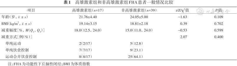 56例FHA患者的年龄为15~32(23.36±4.90)岁;BMI为(18.91±2.49)kg/m2。高雄激素组和非高雄激素组患者年龄、BMI、减重幅度和减重方式占比差异均无统计学意义(均P>0.05),详见表1。