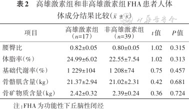 56例FHA患者初诊时均完成了人体体成分检测,2组患者间腰臀比、体脂率、骨骼肌量、基础代谢和骨矿物质含量差异均无统计学意义(均P>0.05),详见表2。