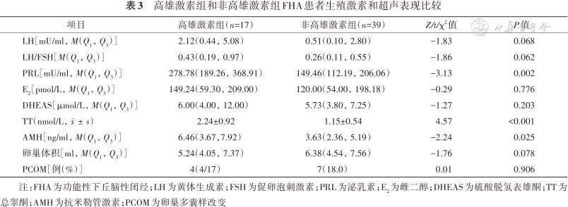 由于FHA和PCOS发病机制均涉及能量代谢和体脂异常、进食和情绪障碍等,都可有月经稀发、闭经和排卵障碍等表现。临床发现部分FHA患者和PCOS存在重叠特征,例如抗米勒管激素(anti-Mullerian hormone,AMH)升高、雄激素过多和超声下PCOM或多个小卵泡(multicystic ovarian morphology,MCOM)。为此本研究以FHA患者为研究对象,分析比较PCOS的雄激素过多这一重要特征在FHA中的表现,为具有潜在PCOS风险的FHA康复治疗提供依据。