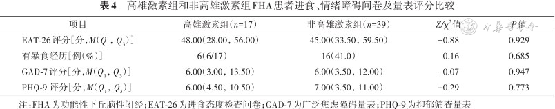 56例FHA患者均完成了进食问卷和情绪障碍量表的评估,2组患者EAT-26、GAD-7和PHQ-9得分差异均无统计学意义(均P>0.05),详见表4。非高雄激素组GAD-7(r=0.455,P=0.005)、PHQ-9(r=0.664,P<0.001)评分均与EAT-26评分相关,高雄激素组PHQ-9(r=0.091,P=0.766)和GAD-7(r=0.304,P=0.313)与EAT-26无相关性。