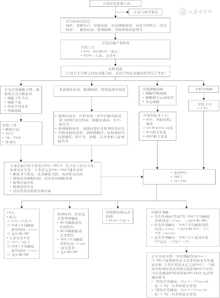 3. 问卷评估及睡眠监测:(1)通过睡眠日记、清晨型-夜晚型问卷(morningness-eveningness questionnaire,MEQ)、失眠严重程度指数(insomnia severity index,ISI)、匹兹堡睡眠质量指数(Pittsburgh sleep quality index,PSQI)、体动仪判断EDS是否为睡眠不足综合征、失眠症、昼夜节律紊乱所致;(2)通过STOP-BANG问卷、不宁腿综合征相关量表、REM睡眠行为障碍相关量表、多导睡眠监测(polysomnography,PSG)判断EDS是否与睡眠呼吸障碍、周期性肢体运动障碍或异态睡眠有关;(3)通过艾普沃斯嗜睡量表(Epworth sleepiness scale,ESS)、斯坦福嗜睡量表(Stanford sleepiness scale,SSS)、卡罗林斯卡嗜睡量表(Karolinska sleepiness scale,KSS)、儿童日间嗜睡量表(pediatric daytime sleepiness scale,PDSS)、乌兰林纳发作性睡病量表(Ullanlinna narcolepsy scale,UNS)、夜间PSG和日间多次小睡睡眠潜伏时间试验(multiple sleep latency test,MSLT)、24 h PSG,判断EDS是否为发作性睡病、特发性嗜睡症、复发性嗜睡症所致。