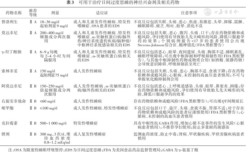 | 莫达非尼 | Ⅱ A | 200~400 mg/d 顿服或分两次服用 | 成人和儿童发作性睡病、特发性嗜睡症、α-突触核蛋白病/脑外伤/神经系统遗传疾病/脑肿瘤/中枢神经系统感染相关的EDS | 不良反应包括失眠、恶心、腹泻、头痛、口干;存在药物依赖和成瘾风险,孕妇使用有导致胎儿先天畸形的风险,降低口服避孕药的效果;个别病例报告<17岁的患者使用会出现Stevens-Johnson综合征、精神错乱(FDA黑框警告) |