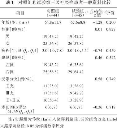4. 对象:最终纳入2021年7月至2022年7月徐州医科大学鼓楼临床学院原发性三叉神经痛患者89例,按照随机数字表法分为试验组(n=45)和对照组(n=44)。