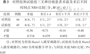 3. 疗效比较:试验组和对照组患者术后1 d、1个月、3个月的NRS评分均较术前明显降低(均P<0.05);两组患者术后同一时间点的NRS评分比较差异均无统计学意义(均P>0.05),结果见表3。