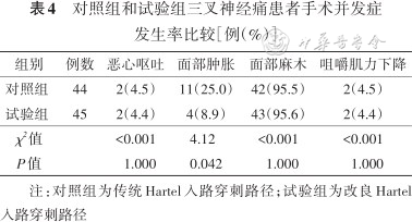4. 并发症比较:对照组和试验组面部肿胀发生率比较差异有统计学意义(P<0.05),两组间恶心呕吐、面部麻木、咀嚼肌力下降发生率比较差异均无统计学意义(均P>0.05)。试验组有2例患者穿刺针进入口腔,及时发现并更换穿刺针,未发生感染,两组患者均无脑脊液漏、角膜反射减弱的并发症发生(表4)。