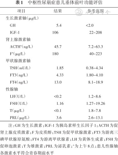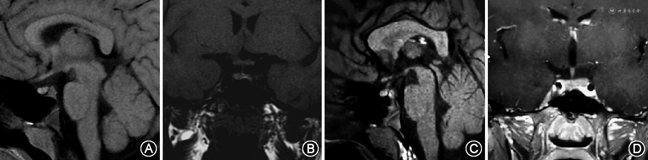 辅助检查:血生化结果:血钠:147 mmol/L,血氯:112 mmol/L,血糖、血钙正常;血常规结果:白细胞:6.10×109/L,中性粒细胞百分比:56.4%;垂体前叶功能评估提示生长激素轴、肾上腺激素轴、甲状腺激素轴功能大致正常,性腺轴符合青春期前的儿童水平(表1);禁水试验:禁水6 h后可见血渗透压升高至311 mOsm/kg、血钠升高至147 mmol/L,同时仍排出低渗尿,尿渗透压116 mOsm/kg、尿比重1.004,尿崩症定性诊断明确;简易去氨加压素试验:服用0.1 mg去氨加压素3 h后,尿量显著减少,尿渗透压升高至509 mOsm/kg,尿比重1.015,中枢性尿崩症诊断明确;尿崩症病因检查:抗核抗体谱:抗核抗体(ANA)低滴度(1∶80)阳性,核型为斑点型(S),其余自身抗体均为阴性;免疫球蛋白、补体、超敏C反应蛋白、血IgG亚类测定、甲胎蛋白、癌胚抗原、β人绒毛膜促性腺激素和血管紧张素转化酶等均正常;垂体增强MRI:鞍区、松果体、基底节区未见异常占位性病变或异常强化灶,垂体后叶短T1信号未见明显显示(图1);视野检查:无视野缺损;纯音测听及声导抗结果未见明显异常;骨龄相:骨龄5~6岁。