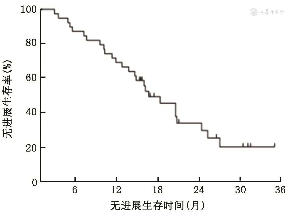 2. 生存分析:39例患者的中位PFS为16.4个月(95%CI:12.1~20.7个月,图1),主要临床特征与疗效确认时间以及一线PFS的生存游泳图如图2 所示。